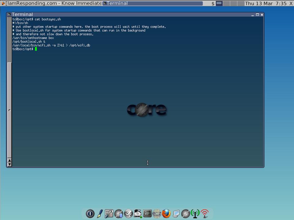 Once I had saved my settings, I set Wi-Fi to connect automatically at boot time. Tiny Core has two places for loading commands and scripts upon startup, bootlocal.sh and bootsync.sh, both in /opt. There is a subtle important difference between the two. bootsync.sh, as the name might imply, isn't asynchronous; commands are run, and they block the boot process until they are finished. The bootlocal.sh is run from bootsync.sh in the background. I needed the Wi-Fi to be loaded before anything attempts to use the Internet. It would be catastrophic if the browser loaded and tried to load the page while the Wi-Fi script still was attempting to connect. One very important gotcha to note is Tiny Core's wifi.sh script will take down the WLAN interface if it does not connect. This confused me at first, making me think I had a kernel module issue. Alas, I didn't, so I saved the proper Wi-Fi credentials, and then I was up and running once again.