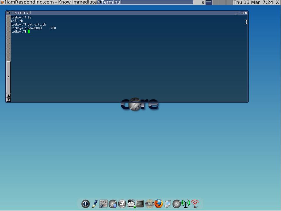 The system booted and everything came up fine. Granted, this came after about four remasterings. Like I said, it's a learning process, and you tweak as you go. Now came the work of making it do what I wanted it to do on boot. The first issue was I needed Wi-Fi. I used the wifi utility to connect to a Wi-Fi network. The standard command-line Wi-Fi utility Tiny Core's wifi extension provides saves the SSID and password settings you provide in a wifi.db file.
