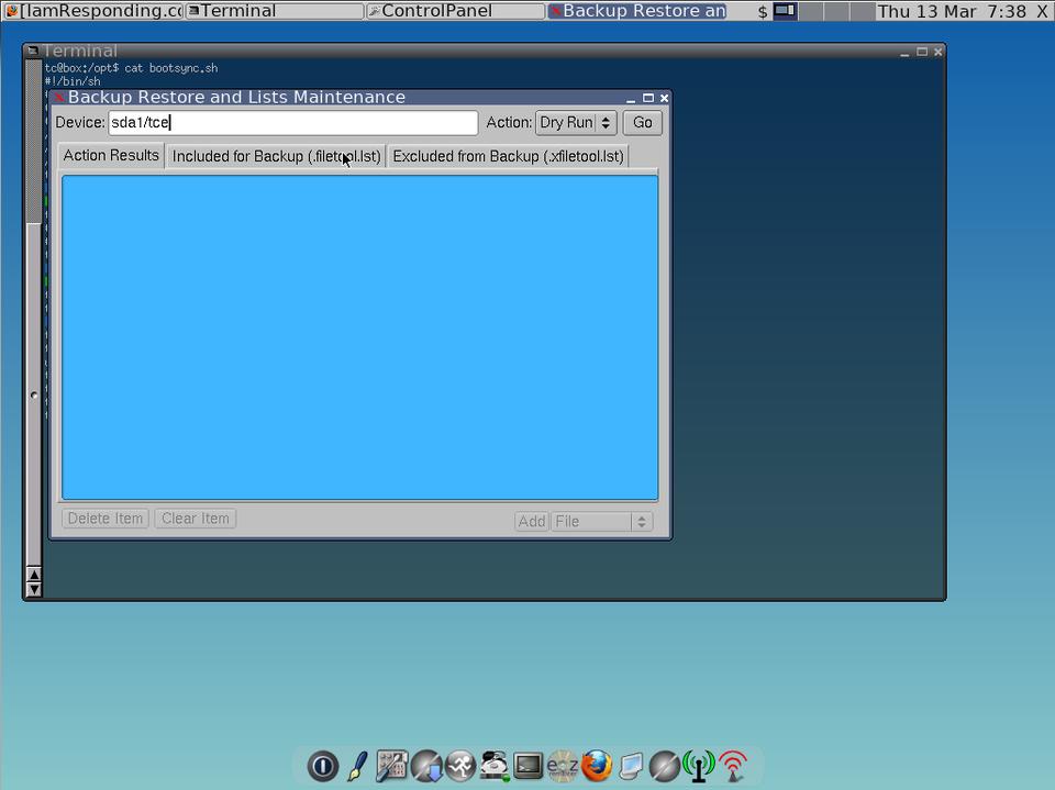 After setting up the browser just how I wanted, it was time to save my settings. I've already said that Tiny Core was incorruptible; what I mean by this is that it starts in the same state all the time. Your settings and anything else done are not saved on shutdown. Everything resides in RAM. When it boots up again, it simply decompresses its image file straight into memory. So what do you do when you need to save settings? Tiny Core lets you save any changes you make to the filesystem in the form of a backup. The backup is simply a tarball of whatever you specify. Tiny Core then can be configured to restore this file on each boot. Tiny Core includes a backup utility. The backup utility creates the tarball file containing anything you specify in the /opt/.filetool.lst and excluding anything in the /opt/.xfiletool.lst. My file include list consists of: