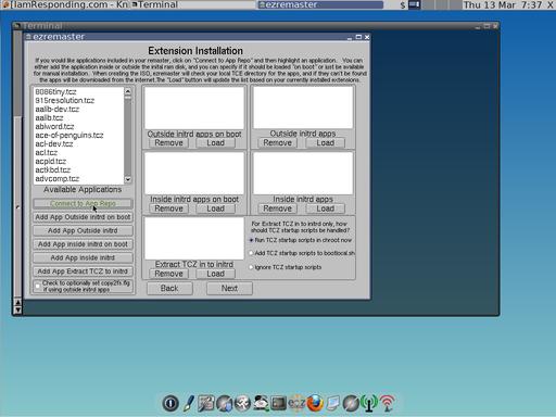 Really, the only way to tailor your system completely is by trial and error. You live, you learn, and you become better. Once I had the extensions I wanted, I chose to have them loaded inside initrd apps on boot. The Tiny Core Wiki does a great job of explaining the differences. I chose this because there aren't too many extensions to load, and they all fit in the RAM of the machine I'm using. This also frees from me doing excessive writes to a Flash drive should the system be running one, or from even requiring a hard drive. The system I'm using has a 160GB hard drive that I installed. It also saves on power usage.