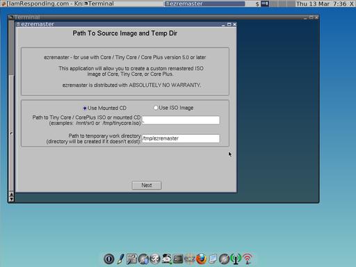 There is a norestore option listed and described in the documentation that tells Tiny Core not to restore any backups. Because I wanted to have my exact settings restored on each boot, I did not use that option. During the Ezremaster process, I specified my backup file. I also told the Ezremaster process to create an ISO file for me.