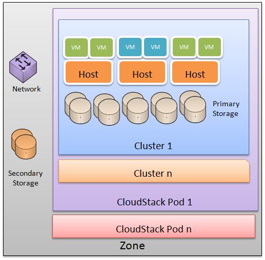Each host has a hypervisor to manage the VMs. A cluster is a collection of one or more hosts and one or more primary storage servers. It can be considered as a set of XenServer servers or a set of KVM servers. Primary storage is coupled with a cluster that stores the disk volumes for all the VMs running on hosts in that specific cluster. Secondary storage is shared by all the pods in the zone that stores ISO images, templates and disk volume snapshots.