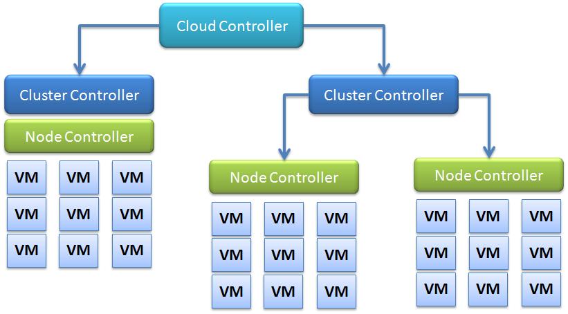 ComponentsNova (compute), Swift (object storage), Glance (image service), Keystone (identity management), Horizon (GUI interface)Management Server; Hypervisor Nodes; Storage Nodes; Layers: Zone, Pod, Cluster, Host, Primary Storage, Secondary StorageCloud Controller (CLC): manages the virtualization resources and APIs, provides the Web interface; Walrus (S3 storage); Cluster Controller (CC): controls execution of VMs and their networking; Storage Controller (SC): provides block-level storage to VMs (EBS); Node Controller (NC): controls VMs via hypervisors