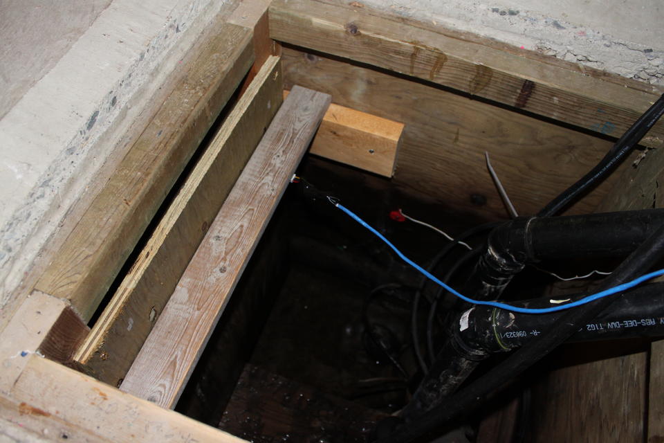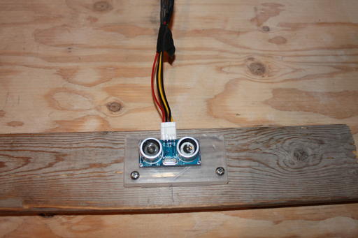 The HC-SR04 is attached to a plastic case and screwed onto a piece of wood strapping. The wood strapping is inserted into the sump pit facing downward and is easily adjustable and removable if needed. The Cat5 wire is securely taped to the sump pump's ABS pipe and an open wall stud to prevent tangling and disconnection of the wire when removing the sump pit lid.