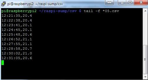 Figure 6 shows using the tail command to demonstrate the CSV file being updated in real time by raspisump.py.