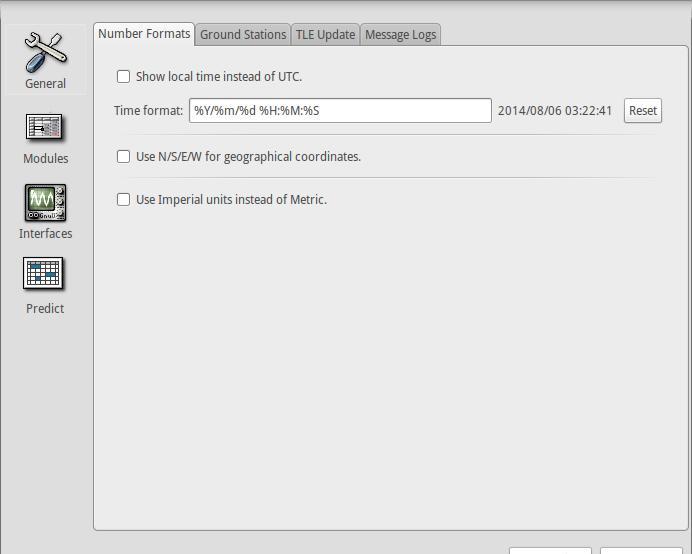 All the other configuration options are available under the menu item Edit→Preferences (Figure 5). Here, you can change options like the number formats used or the geographical coordinates. There also is a tab for ground stations, where you can edit or add ground stations.
