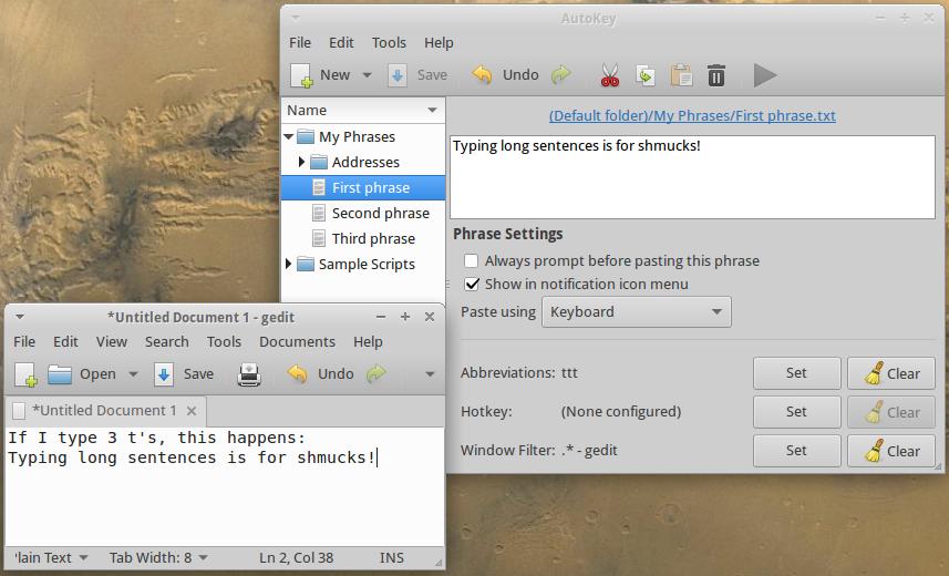 Unfortunately, there aren't too many options in Linux for really good text-replacement apps. My personal favorite is Autokey. It can be a challenge to set up, but that's mainly because it's so powerful. If you want text replacement to work only in a particular app (think programming code shortcuts), it can be set to work only with those apps. If you want to have a special hotkey required before text replacement works, that's an option too. In the screenshot here, you can see I make a simple auto-replacement shortcut so that every time I type “ttt”, it replaces it with a sentence. It works only in gedit, because that's the constraint I set in the settings.