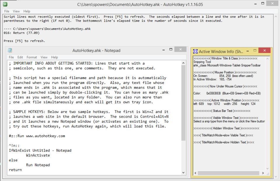 The premise for AutoHotkey is the same as Autokey for Linux. Type a quick short bit of text, and it will expand that shortcut in the predefined text you tell it to. I find this useful while programming, as creating those curly braces in pairs is very useful. The program is a bit of a bear to configure, because there's no GUI to configure keys. In order to configure the program, you write a text-based script that defines your shortcuts.
