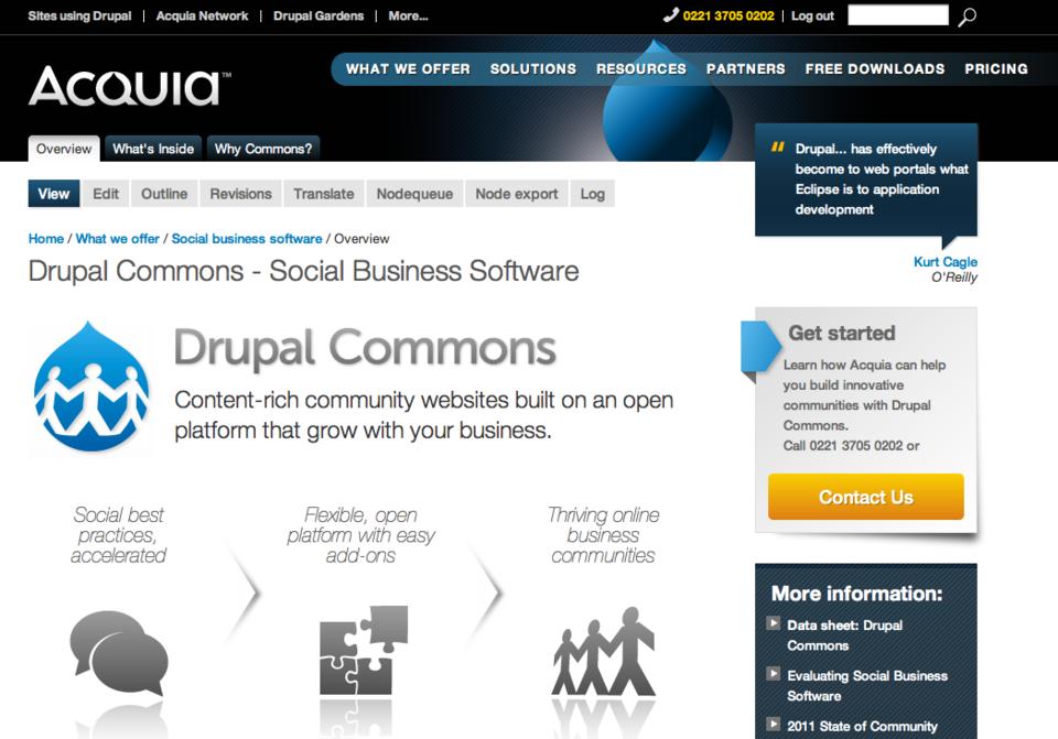 Collaboration — Acquia Commons (https://www.acquia.com/products-services/drupal-commons-social-business-software) is a ready-to-use solution for building internal, external and cross-over communities. It provides a complete social business software solution for organizations to add “the social layer in the enterprise”.
