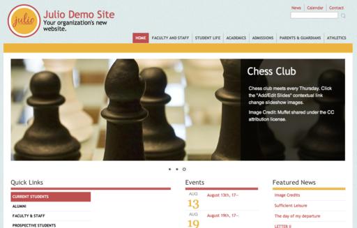 Education — Julio (julio.funnymonkey.com) is a distribution targeted for schools, school districts, small colleges and academic departments within universities. It features calendars, clubs, teams, announcements, departments, staff directories and more.