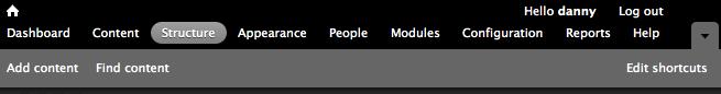 To gain insight into existing content types and Fields on your site, navigate to /admin/structure/types, or use the admin toolbar: Structure→Content types. Figure 1 shows the administrator toolbar at the top of the Admin Drupal UI in the browser. You'll use this a lot to navigate the admin area for various tasks. This assumes you have admin access to a Drupal site or at least have been given the proper permissions by an admin to see and use the toolbar.