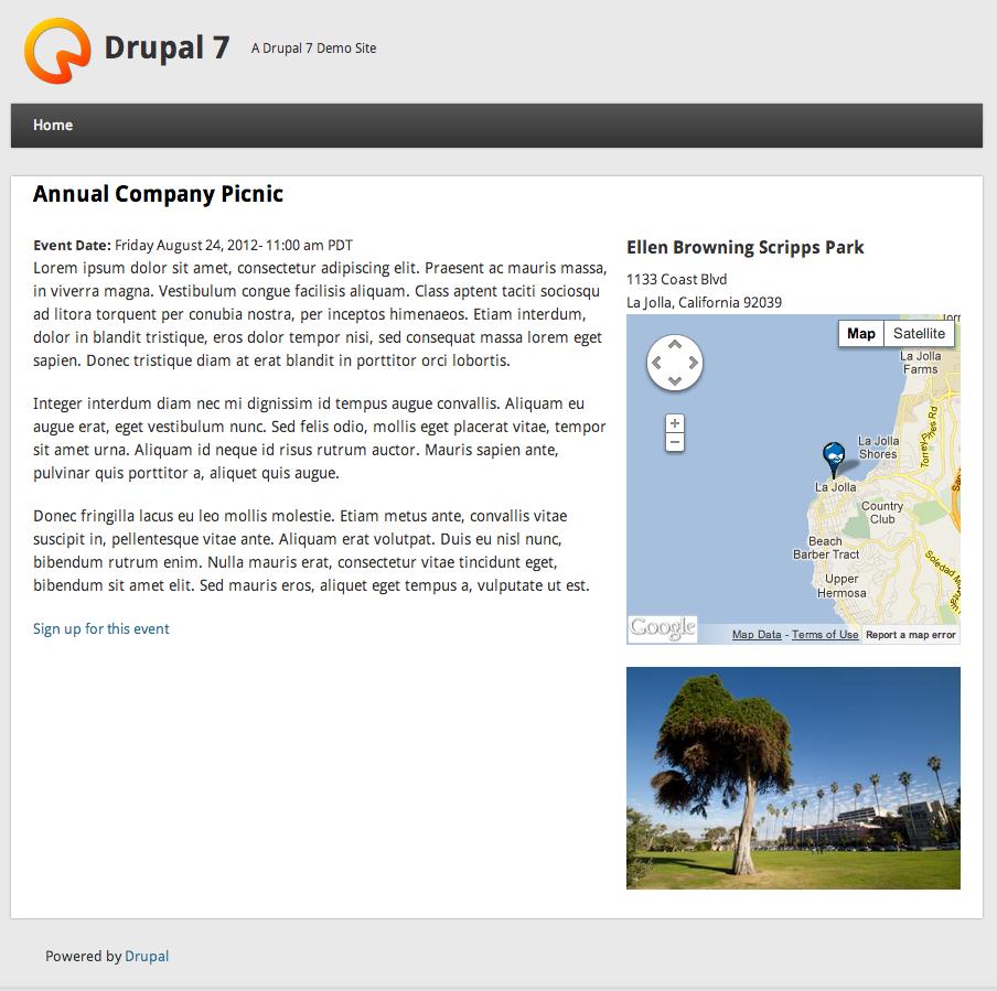 From the admin toolbar, click on Content, and then choose Add content, and choose Event. You now will see a blank node create form. Fill in a Title, choose your Date, and fill in some Overview Text. Next, choose an address for your event, and once it's filled in, click the Geocode this address button, and your little map below will re-center itself on your address. Finally, upload an image, choose a link/title, and save your node. Figure 10 shows the final themed layout.