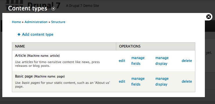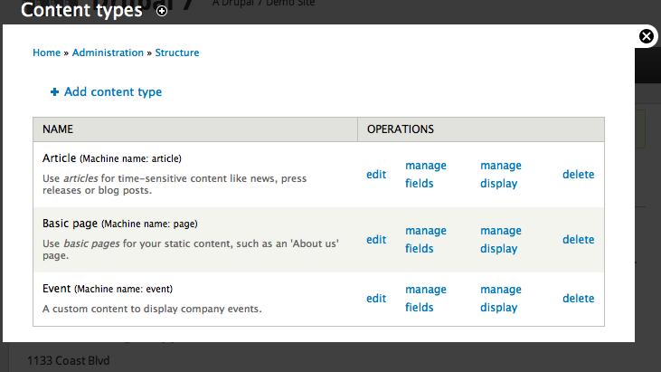 Figure 2. The content type landing page is where you can edit your content types and manage their fields and display.