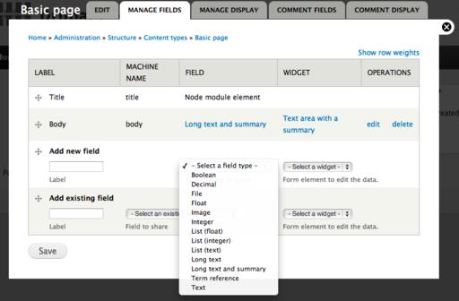 You also can edit a content type, add and edit Fields, and manage its display from this page. Figure 3 shows existing Fields and a select menu to add new ones for a content type.
