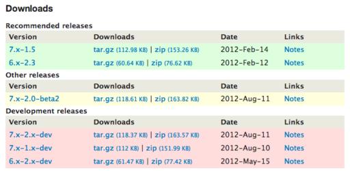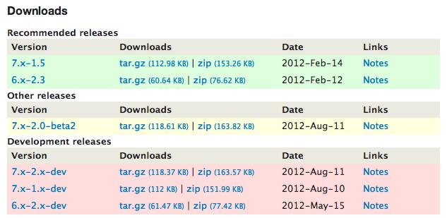 Figure 5. The latest recommended release of a module is shown highlighted in green (7.x-1.5 in this case). Dev releases are red, and a new 2.x beta branch is yellow.
