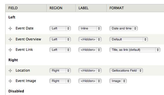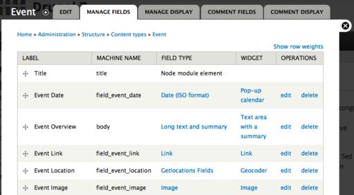 Figure 7. The finished Fields page for Event. You can re-order the fields by dragging the little + icons under the label, but you must save the page after doing so.