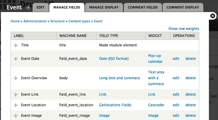 Now you're ready to add/edit your custom event fields. Click manage fields for Event. You'll see that the Body Field already exists. Click to edit on Body, and simply change the Label to Event Overview, and save the settings.
