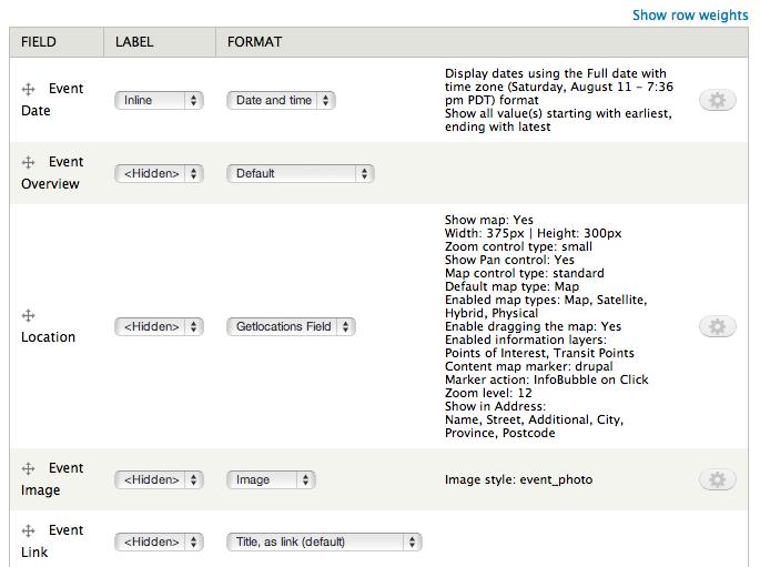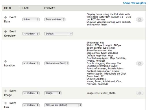 Now you just need to do a little theming using the Manage Display tab for your Event content type. This will be a two-part process. The first is to get some reasonable defaults for your display. Using the admin toolbar, head back to Structure→Content types→Event→manage display. Using the “select lists and drag” icons, make your layout look like Figure 8. Note the Gear icons at the far right; you can click on those to fine-tune your settings, but always remember to choose Update, and then save the page after any changes. You'll notice with the Date and Event photo, you now have the respective format and style you created previously.