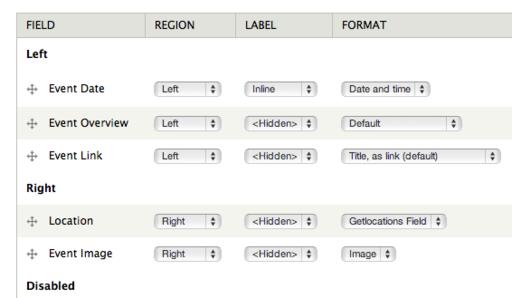 Let's add in a Display Suite layout; this is where all the magic happens. At the bottom of Manage Display, find the tab called Layout for event in default. Click, and using the Select a layout list, choose Two Column, and save the page. You'll notice you have an updated UI showing Right, Left and Disabled. All Fields default to Disabled, so position the Fields where you want them in your new two-column node layout. You either can drag your Fields up to the right or left area or use the Region select list to choose. I find the latter to be easier. Figure 9 shows the layout after repositioning Fields and saving the page.