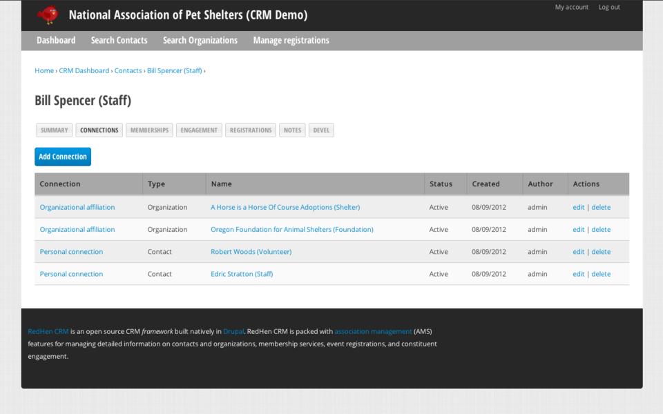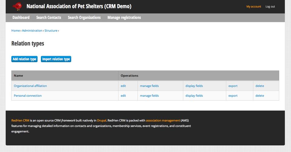 Now that you've learned about RedHen, you most likely will want to know the steps involved in building a useful application with it. Below is a step-by-step tutorial for setting up an association management system (AMS) for the National Association of Pet Shelters, an fictional nonprofit organization. For those who want to follow along, the complete demo application is available for download as an installation profile called RedHen Demo (drupal.org/project/redhen_demo) on drupal.org.