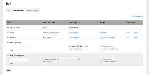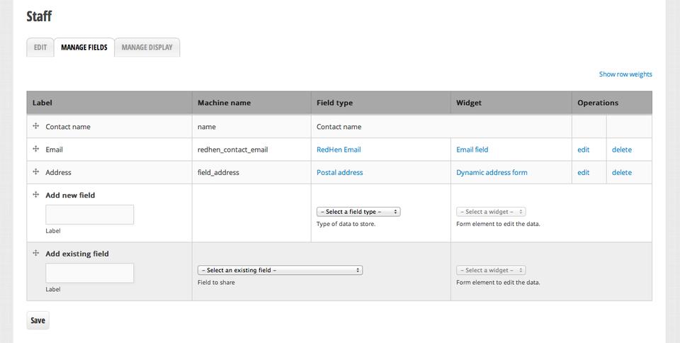 Now that your bundles have been created, you can add fields to them. Each bundle has a “manage fields” link. To manage fields for your staff contact type, for example, visit /admin/structure/redhen/contact_types/manage/staff/fields. You'll notice the e-mail field, which RedHen adds automatically behind the scenes to each contact bundle, because e-mail is required for several core components of the system. Incidentally, we developed our own e-mail field that mimics v-card structure allowing for multiple e-mail addresses per contact that have different labels and flags for default, bulk and on-hold statuses. In addition, the contact name is visible, although it doesn't have any settings to manage. This is because name is a property on a contact, which Drupal allows developers to expose as a “pseudo field”, so that its position can be managed along with other traditional fields.