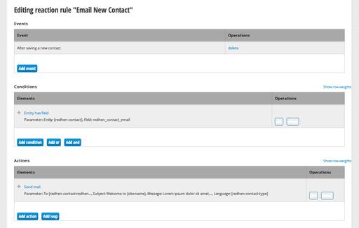 Similarly, business rules can be extended using the Rules module, which provides an interface for defining logic based upon a trigger→action model. RedHen again leans on the Entity API to expose RedHen entities into this model, so that you can, for example, send an e-mail to a contact when a related membership entity is updated.
