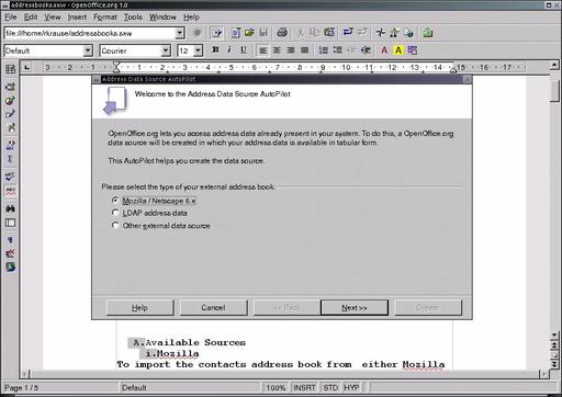 Address books can be imported from existing sources such as Netscape's address book or an LDAP server. They can also be created from a dBase file, spreadsheets or plain-text files. OpenOffice.org's wizard, called AutoPilot (see Figure 1), can ease the task of importing address information. Examples of using AutoPilot are presented below.