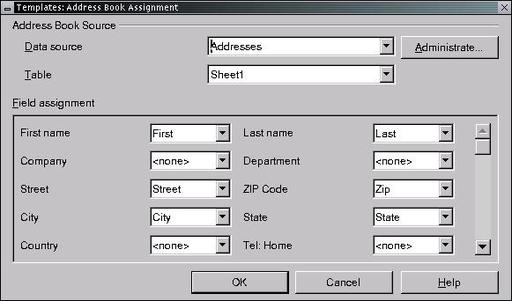 Next, map the spreadsheet columns to OpenOffice.org's address fields. This is accomplished by clicking on the Field Assignment button, selecting the appropriate spreadsheet column header for each address field and then clicking OK (see Figure 4).