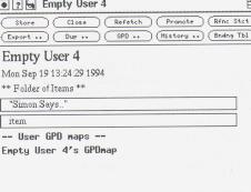 Now we'll start writing our upcoming article for Linux Journal about “Linux on the Road”. We prefer to store the article in our home directory (the “Empty User 4” window). First, move the cursor to the “Simon Says.” line in “Empty User 4” window. Then, insert a new item in folder view by giving the command meta-l meta-i (insert closest plural), which will create a sibling of the current item. (See “The xlincks User” manual or the next part of this series for more information.)