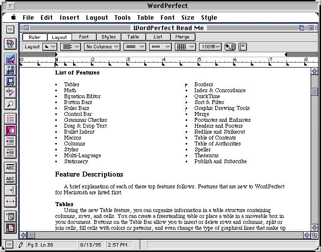 Now we decided to get down to work and install WordPerfect 3.0. Programs like WordPerfect have a particular use for Executor/Linux users who want to use commercial productivity applications that are not yet available under Linux or who simply want to make use of their old documents without having to switch operating systems. The WordPerfect installation requires knowing how to handle floppies under Executor, as mentioned above, but completes speedily and without problems. A new folder is created, and a double click starts WordPerfect.