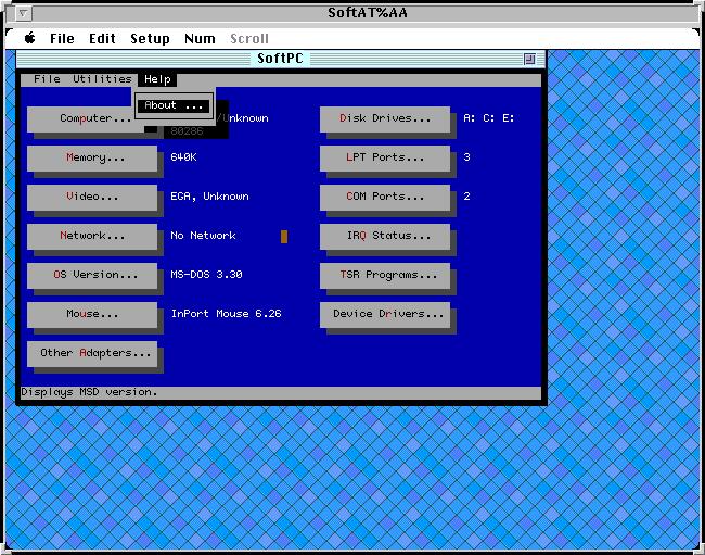 For our final software test, we decided to stack our emulators. With some trepidation, we booted up Executor, and loaded a program called SoftAT which is—you guessed it—a DOS emulator for Macintosh. Did it work? You bet. We even managed to mount an E: drive under SoftAT to the directory /dos, which was a DOS partition mounted under Linux, provided by Executor. Got your head around that? The short version is, it was really cool. Take a look at MSD.EXE running under SoftAT (see Figure 4).