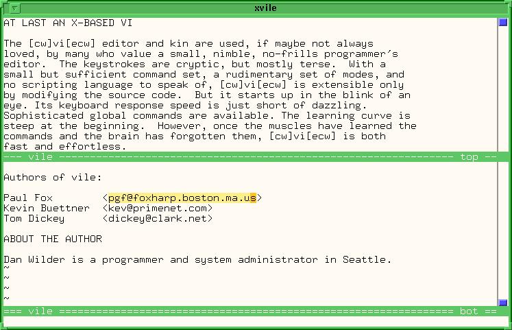 An example xvile window is shown in Figure 1. The shaded text in the lower window is a mouse selection, to which any of those cursor-movement “operator” commands can be applied using ^s (which I've rebound to g). So in traditional vi, to delete a word starting at the cursor, you would type: