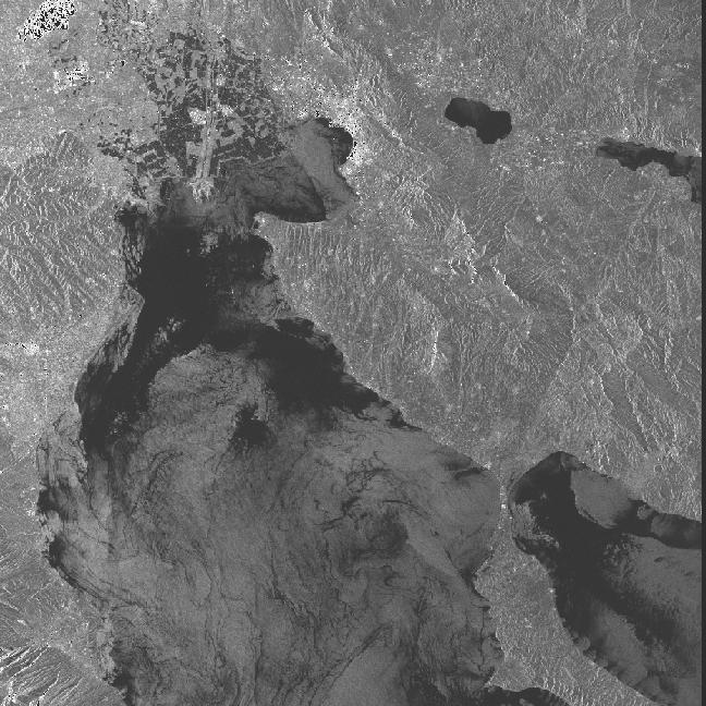The scene in Figure 4 is a good SAR image of the Gulf of Thermaikos in the Aegean Sea, just off the coast of Greece. The image was taken by the ERS-2 SAR on 25 May 1996 at 20:43 GMT. A number of oceanographic features evident in this image which are of general interest. The numerous black swirls and bands across the water surface correspond to surface slicks. Much of the slick material comes from a river outflow at the edge of the city of Thessaloniki, seen at the top left in the image. This reverine material is concentrated around the top of the bay and is then distributed throughout the gulf by eddies, tides and wind-driven currents. Incidently, the dark square patches around the town are probably rice fields which give very little radar return signal. In the bottom right of the image is the edge of Mount Olympus, mythical home of the Greek gods.