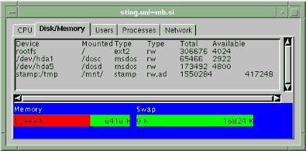 Disk and memory information (free, used, swap)