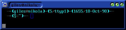 My default prompt includes my user name “giles”, the name of my work machine “nikola” and my home directory /home/giles. The simplest prompt is a single character. I can change my default prompt to a simple $ by typing: