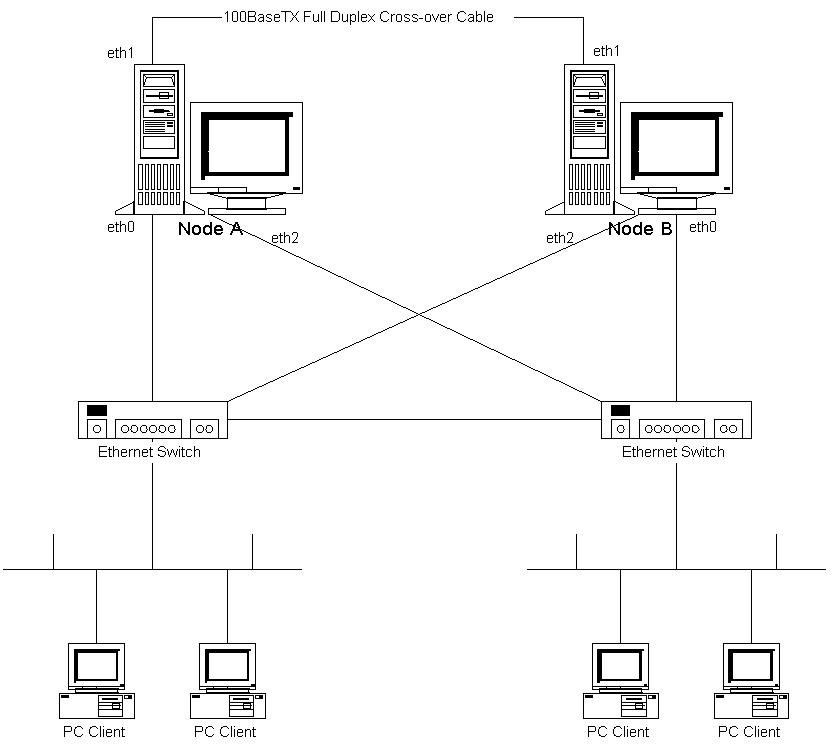 The network diagram shows the three network interface cards (NICs) in each server. The first NIC in each server is used for the main LAN access to clients. Each node is plugged in to a separate Ethernet switch or hub to give redundancy in case of a switch lockup or failure. (This actually happened to us not so long ago.) The second NIC is used for creating a private inter-node network using a simple cross-over 100BaseTX full-duplex Ethernet cable. A cross-over cable is far less likely to fail than two cables plugged into an Ethernet hub or switch. This link is primarily used for disk mirroring traffic and the cluster heartbeat. It also helps take the network traffic load off the main interface and provides a redundant network path between the nodes. The third NIC is the redundant LAN access card used for MAC and IP address takeover in the event of a remote node failure in the cluster. Again, they are plugged in to different Ethernet switches or hubs for greater network availability.