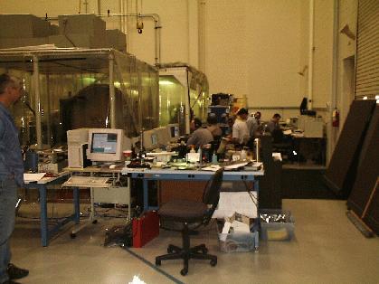 Figure 1. The high bay at SDL. The SABER test chamber is under a clean tent on the left. To the center and right are engineers operating the instrument during calibration tests. The computers mentioned in this article are along the right wall.