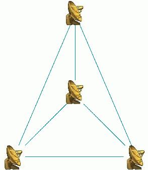 Without going into excessive technical detail, here's how aperture synthesis works. Several radio telescopes (antennae) are used, and the signals from each of them are captured, sent via wire or microwave “waveguide”, digitized and fed into a special-purpose computer known as the “correlator”. This one-of-a-kind computer takes the signals from each antenna and correlates them with all other signals. The result is a series of signals called “baselines”, as they represent the correlation of the signal from the ends of a baseline joining the two antennae. For a set of n antennae, you get nx(n-1)/2 baselines. If n is 4, for example, you get (4x3)/2 or 6 baselines (see Figure 3). You don't correlate an antenna with itself, and you don't count antenna.1-antenna.2 and antenna.2-antenna.1 baselines as separate.