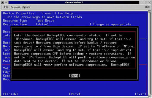 The installation script is easy to use. It is a command-line script with character graphics (see Figure 1), similar to the main program. Arrow keys move the cursor from field to field, but the tab key may not. I found the inconsistent responses to the Tab key to be disconcerting. For text entry, you can toggle between insert and overwrite modes using the Insert key on a standard PC keyboard, which is very nice. I used that capability to prepend the type of drive to the description of each tape drive. On-line help is readily available during both installation and normal usage (see Figure 2).