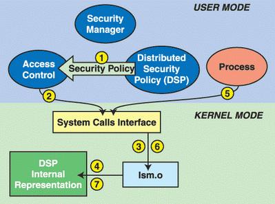 Kernel space: responsible for implementing both the enforcement and the decision-making tasks of access control as separate responsibilities. The kernel space maintains the security policy upon which it bases its decisions. The security policy is supplied by the security server and stored in the local memory for fast access (hash table).