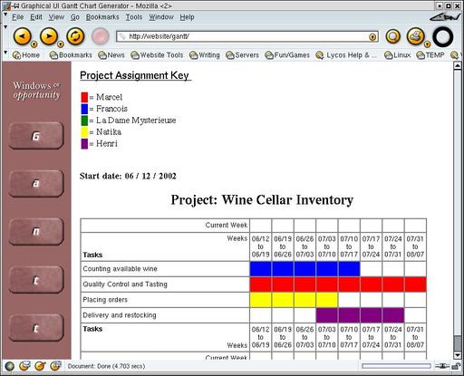 I should tell you that you need to do this as root. If you have never run a Perl CPAN install before, you will be asked a number of setup questions. This only happens once, mes amis--other than that, it is a very smooth process. To use the package, point your web browser to the appropriate URL. On my system, it looked something like this: http://webserver/gantt/.