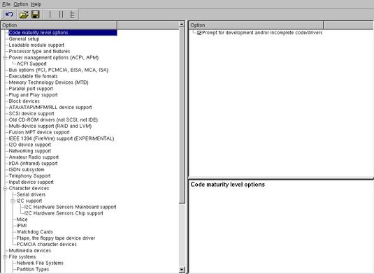 To configure different kernel options, a user runs either a text-mode or a graphical kernel configurator. The text-mode configurator can be run with make config and prompts the user to select configuration options in order (Figure 1). The ncurses text version is more popular and is run with the make menuconfig option (Figure 2). The graphical configurator is run with make xconfig and uses Qt as the widget set (Figure 3).