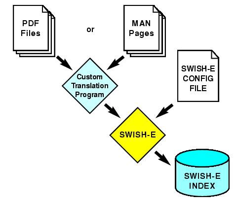 For SWISH-E to index arbitrary files, PDF or otherwise, we must convert the files to text, ideally resembling HTML or XML, and arrange to have SWISH-E index the results.