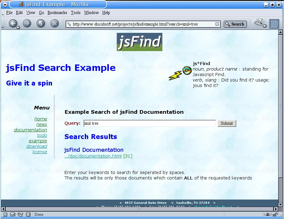 The jsFind keyword search engine itself is a small JavaScript program of about 500 lines. A browser that supports DOM Level 3 JavaScript extensions can load XML files. The current versions of Mozilla, Netscape and Microsoft Internet Explorer all support these extensions, and the upcoming release of Konqueror will do so as well. The index is stored as a set of XML files, and the JavaScript searches through these in an efficient manner to generate results of a keyword search. These results then can be posted back to the Web page that requested them, also using JavaScript.