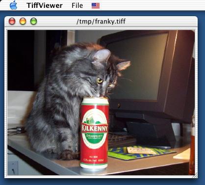 As you have seen in this section, porting the application from GNUstep to Mac OS X is rather trivial. No code changes were required. As under GNUstep, you can load a TIFF file in the application and try to resize the window. You should see the image view automatically resizing both horizontally and vertically, as specified in the main gsmarkup file. You also should notice the Apple-style horizontal disposition of the application menu, as shown in Figure 2.