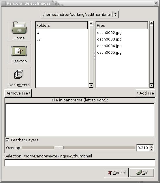 Fire up The GIMP. Pandora should now be available under the Extensions (Xtns) menu as Make Panorama. Select the photos you want to stitch together and click the Add File button; under The GIMP 1.2, you need to add the photos individually, as they should appear from left to right. It's possible to create vertical panoramas, but you need to make use of the rotate feature, as Pandora works horizontally.