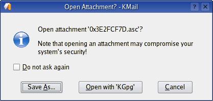 As wonderful as all this encryption and decryption stuff is, there are some problems. For instance, many packages (including KMail) will encrypt the message in-line, but a few others, such as Evolution, do not. Instead, encrypted messages are MIME attachments. Consequently, reading a message from KMail (or Eudora or Outlook) in Evolution requires that you save the message as a text file. You then can decrypt it with this: