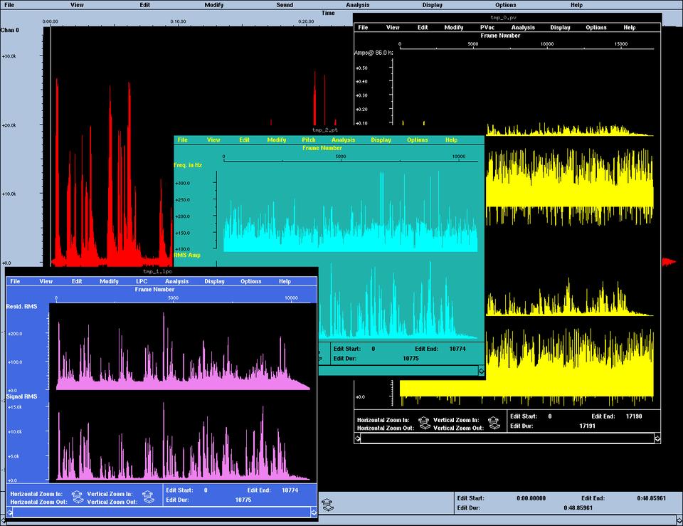MiXViews provides a strong suite of the basic soundfile editing functions and adds some features found in no other Linux soundfile editor. Phase vocoding and linear predictive coding (LPC) are digital signal analysis/resynthesis tools more commonly associated with software sound synthesis programs such as Csound or Common Lisp Music. These tools analyze a sound for its frequency and amplitude values and store those values in special analysis file formats. An analysis file can be read by a program such as Csound that gives the user independent control over the frequency and amplitude components of the analysis data before its resynthesis to a soundfile. MiXViews provides a complete suite of its own LPC and phase vocoder utilities; it also can read and edit analysis files created by the Csound phase vocoder.