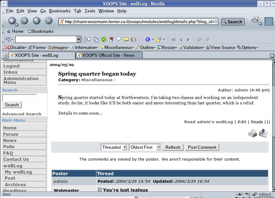 WeBLog provides a number of other useful features, ranging from RSS syndication to searchable and browseable archives, to the ability to comment on a posting. You also can ask to be notified when a new posting is added. Such notifications are placed in the XOOPS message system and are flagged on the main menu when you enter the site.