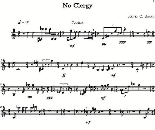 In No Clergy, performers play on-screen notation presented through a Web browser. The audience has Web browsers open to pages with standard CGI forms, allowing them to react to what they're hearing by entering data. The piece's scripts then process the data, affecting the subsequent pages of notation presented to the performers.